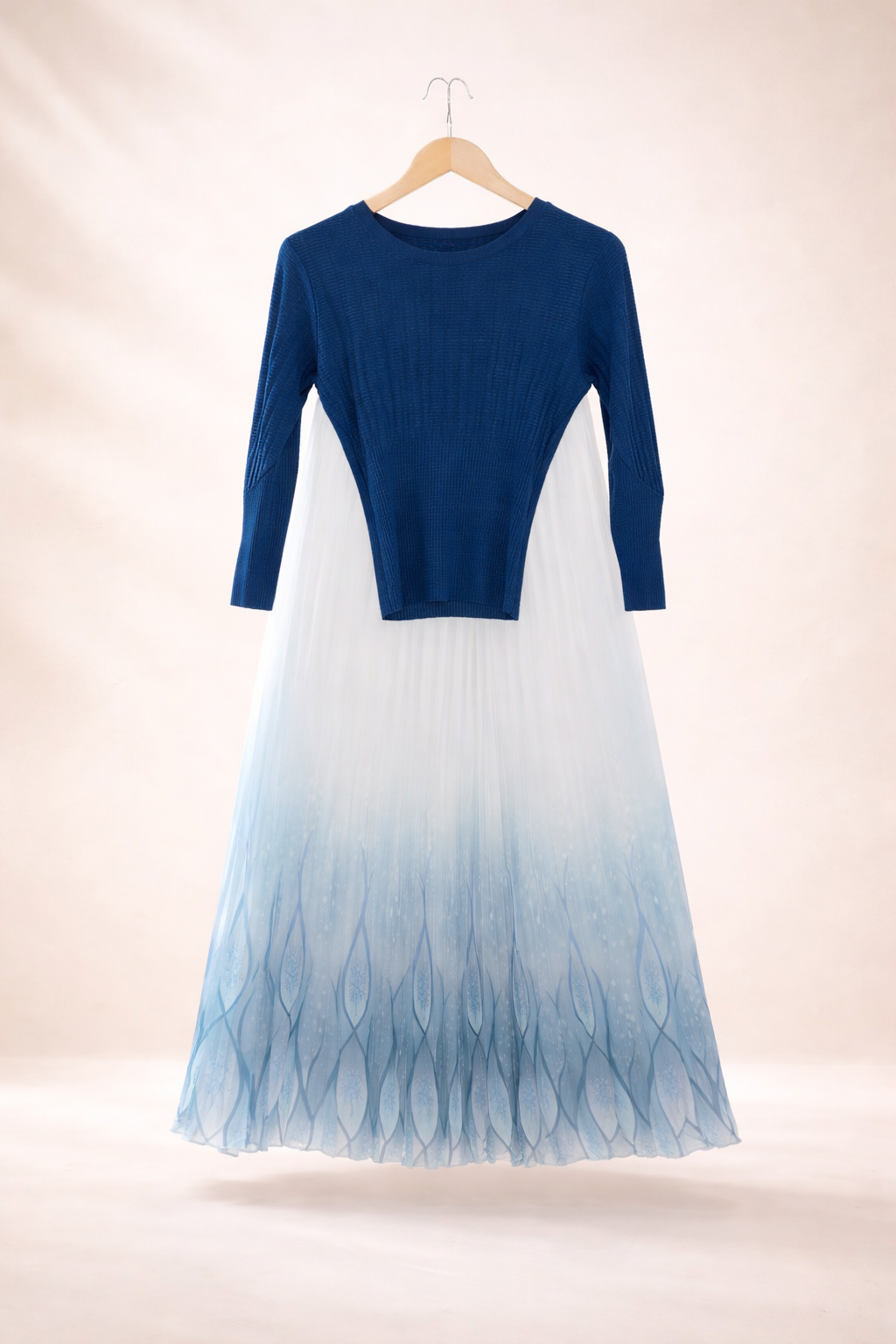 Step into effortless elegance with the Aveline Blue and White Pleated Skirt Set, a beautifully curated two-piece ensemble designed to make a statement. This set features a sleek, ribbed Blue fitted top paired with a flowing, pleated midi skirt that showcases a stunning gradient pattern.